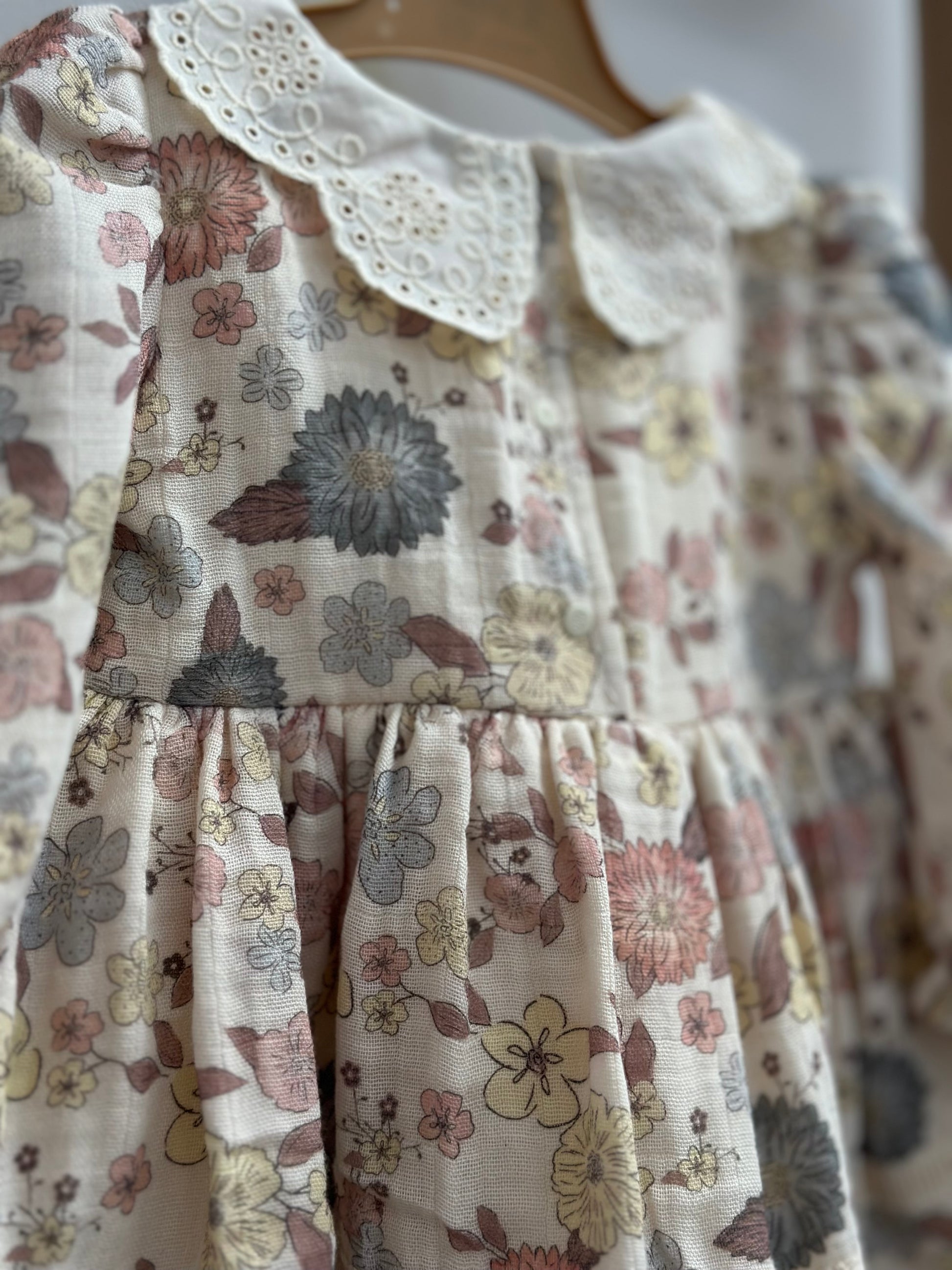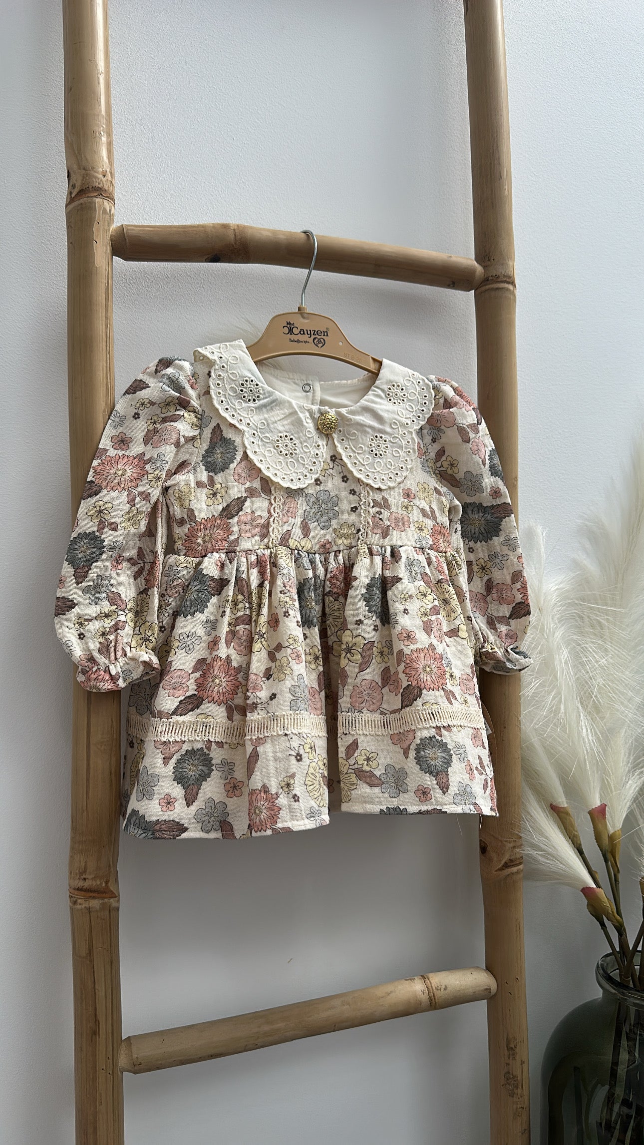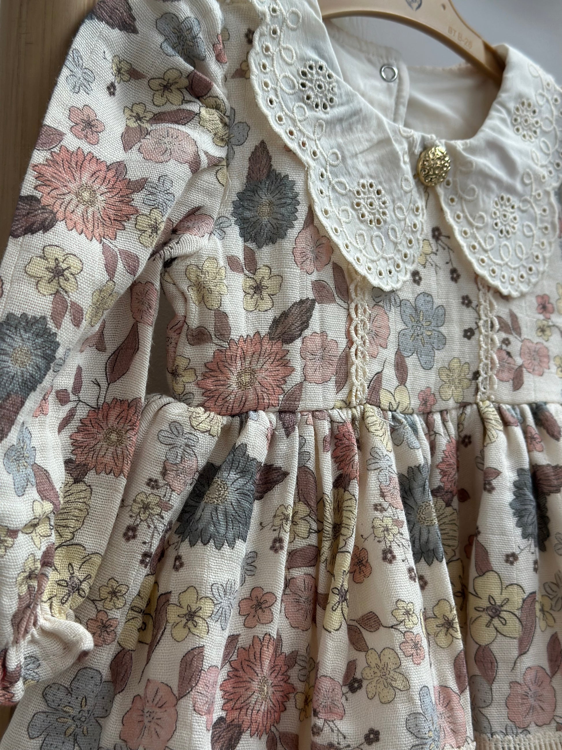 Rochiță elegantă pentru fetițe, realizată din material ușor și confortabil, cu imprimeu floral în tonuri pastelate. Modelul are croială lejeră cu volănașe și detalii delicate din dantelă, perfectă pentru un look rafinat. Gulerul amplu, brodat și accesorizat cu nasture decorativ, oferă un aer vintage și fermecător.