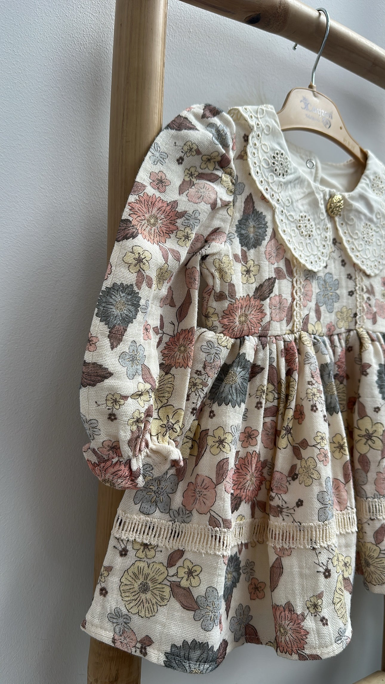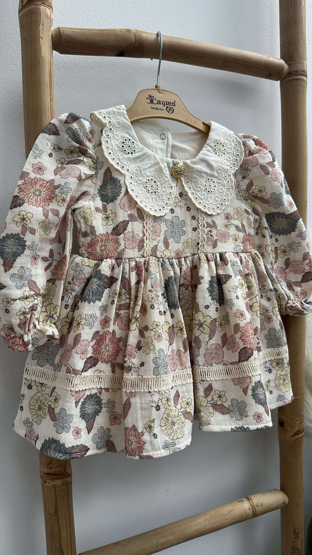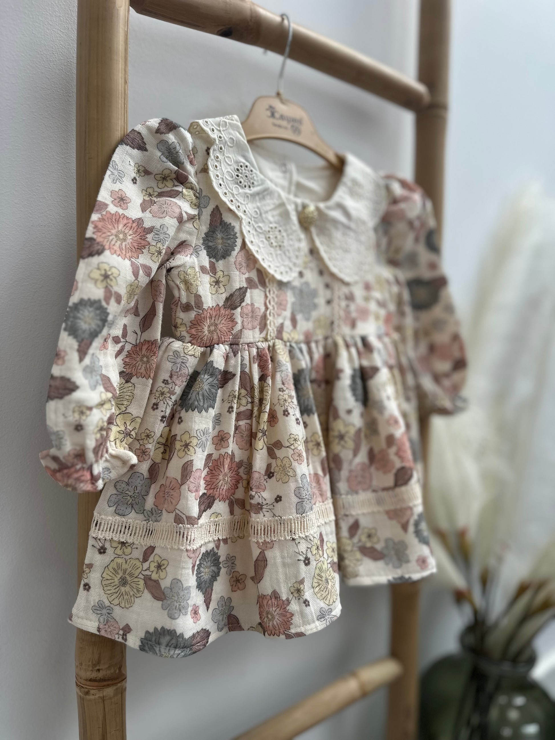 Rochiță elegantă pentru fetițe, realizată din material ușor și confortabil, cu imprimeu floral în tonuri pastelate. Modelul are croială lejeră cu volănașe și detalii delicate din dantelă, perfectă pentru un look rafinat. Gulerul amplu, brodat și accesorizat cu nasture decorativ, oferă un aer vintage și fermecător.
