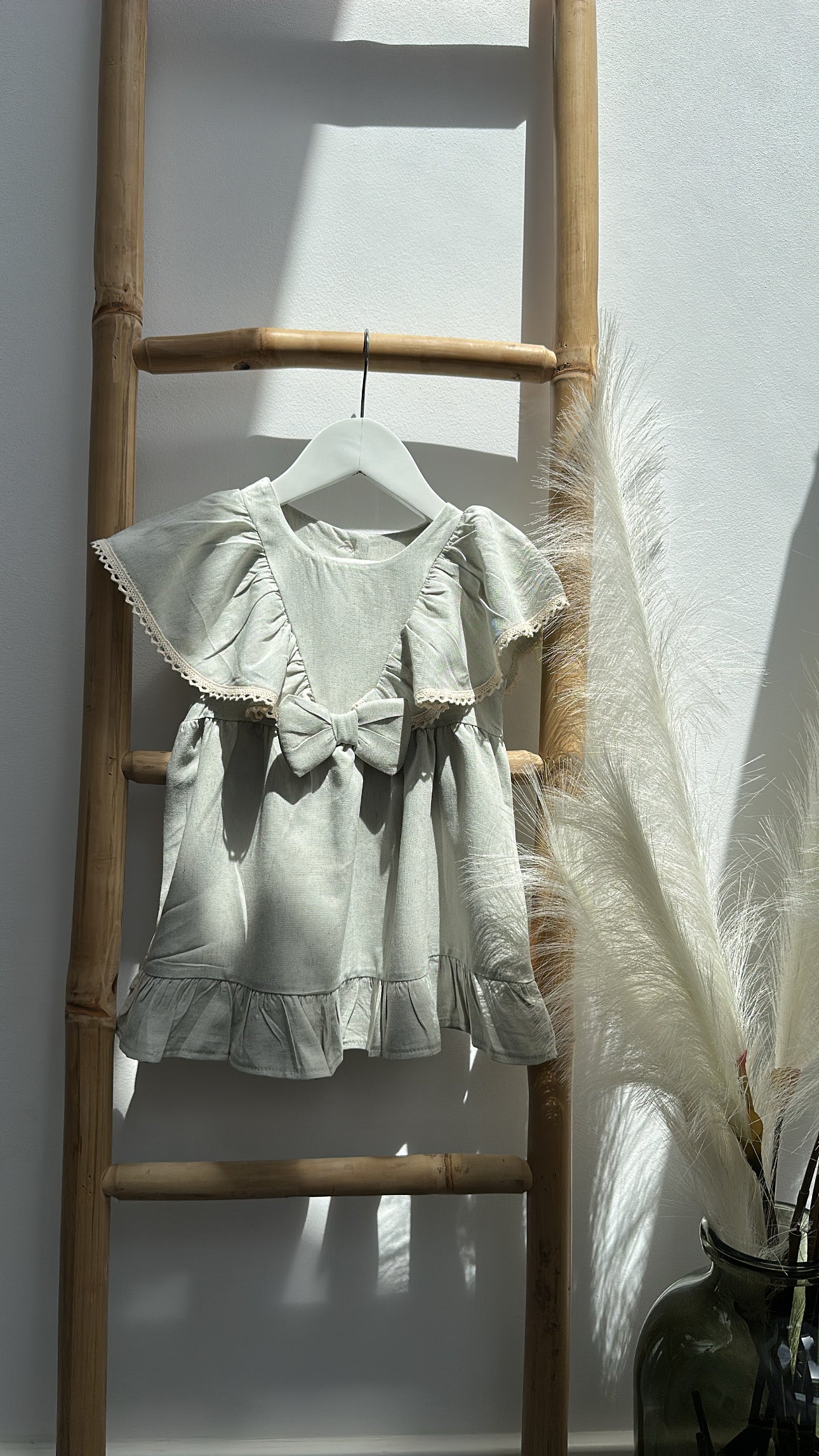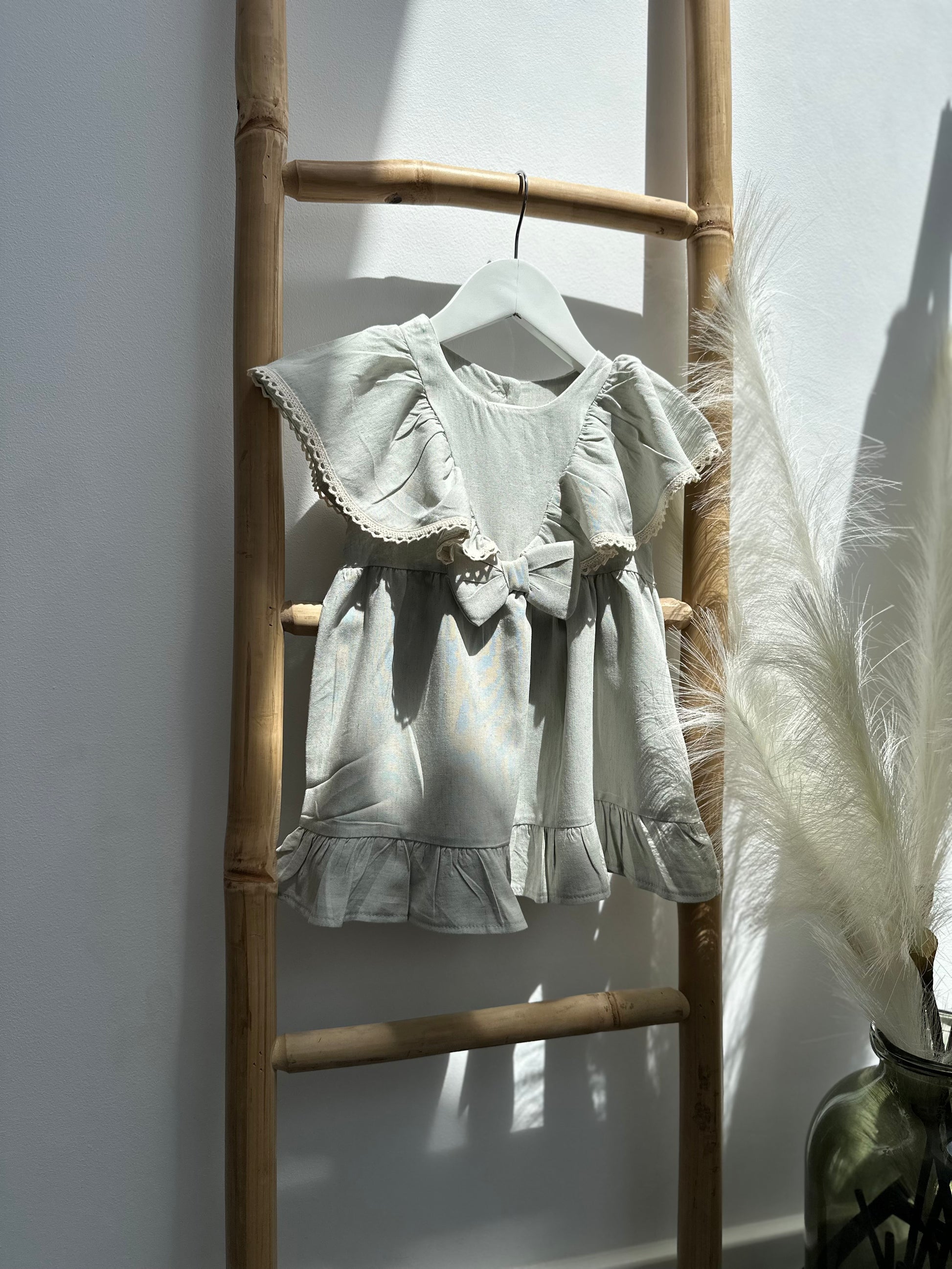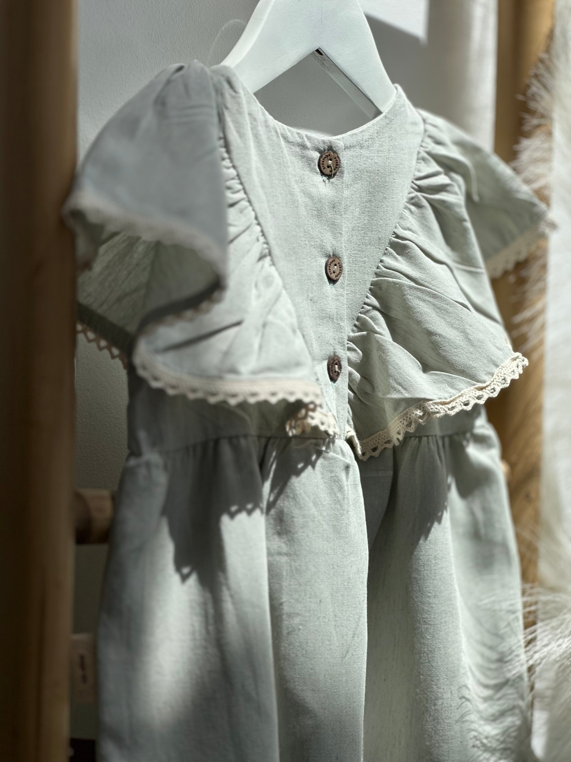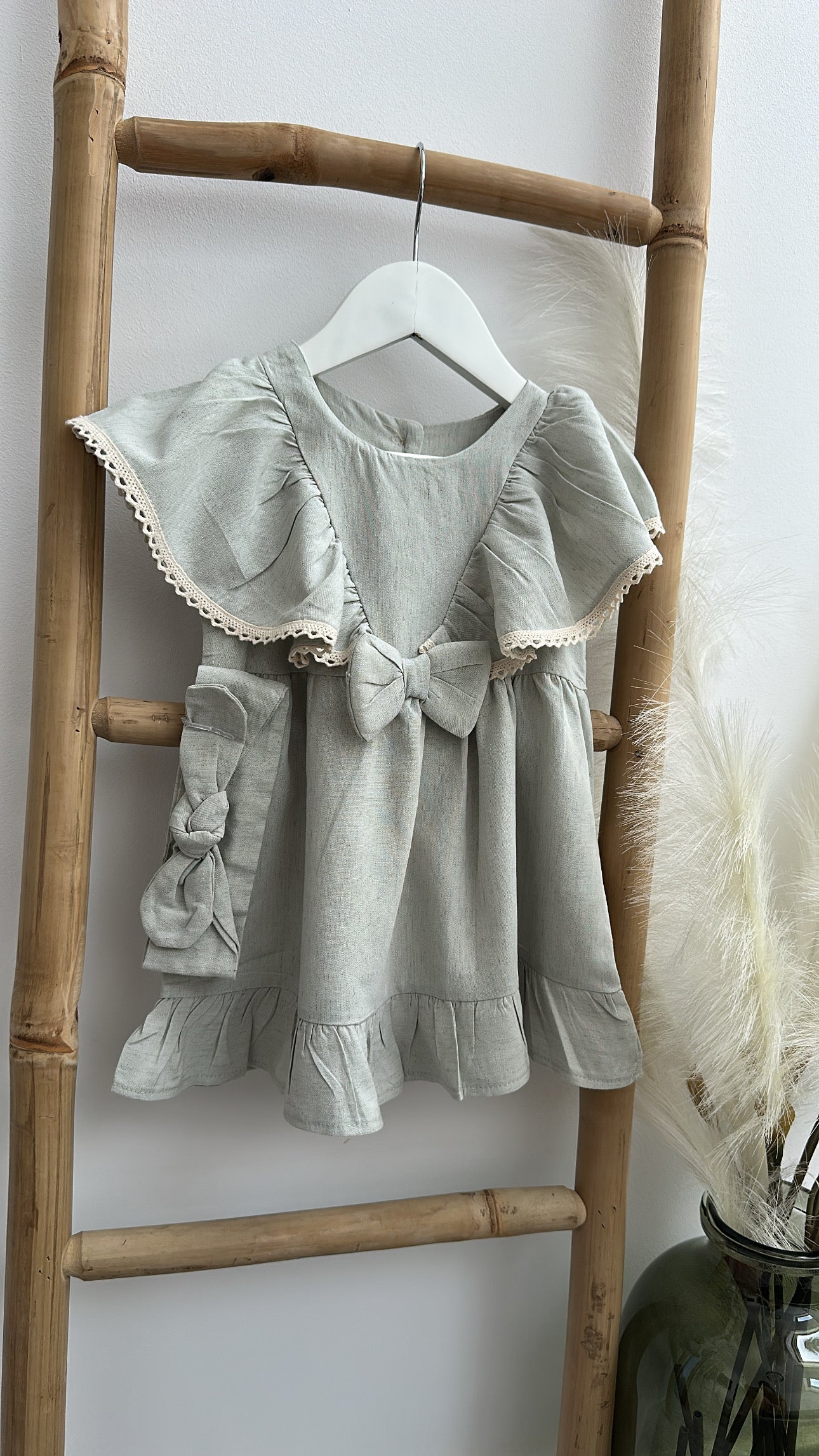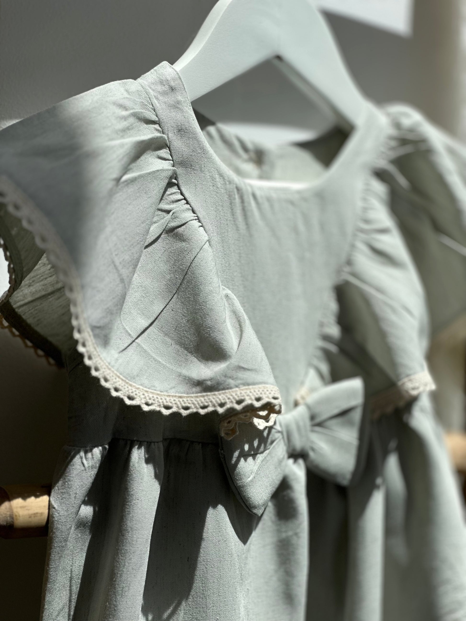 Rochiță adorabilă pentru fetițe, realizată dintr-un material moale, plăcut la atingere, ideal pentru pielea sensibilă a celor mici. Nuanța elegantă de verde salvie este completată de detalii rafinate: volănașe cu bordură delicată din dantelă și o fundiță decorativă în partea din față. Bentița elastică asortată întregește ținuta, fiind perfectă pentru ședințe foto, evenimente speciale sau plimbări în aer liber.