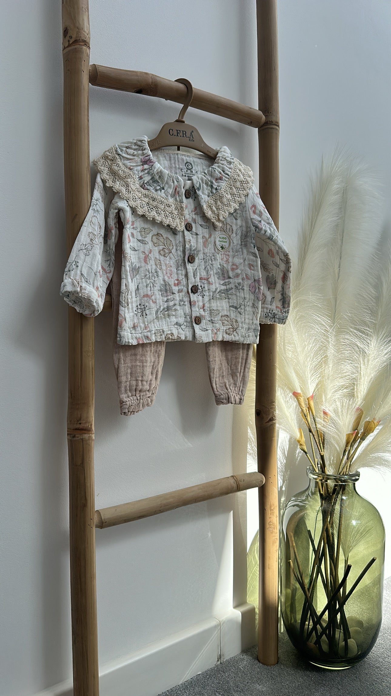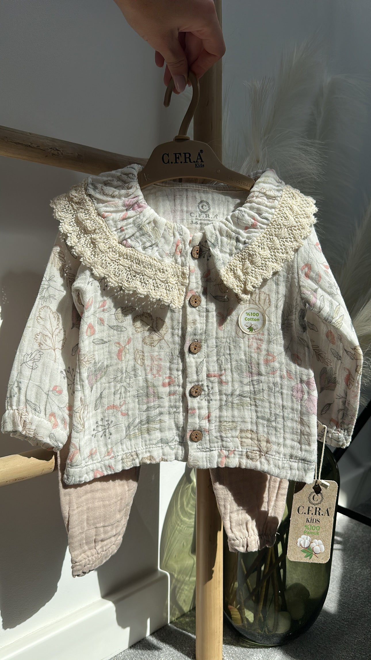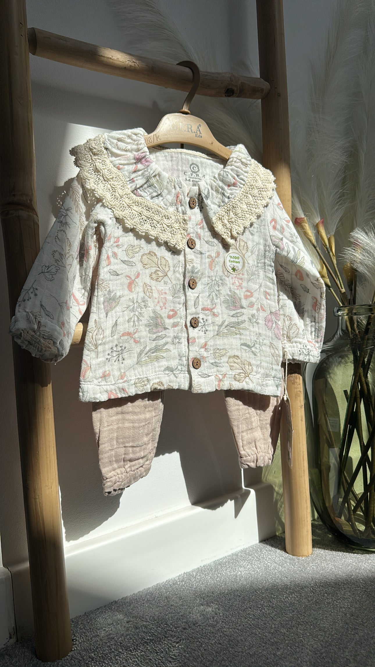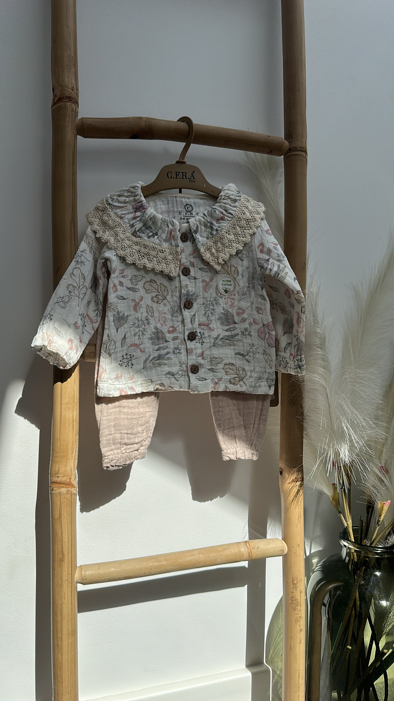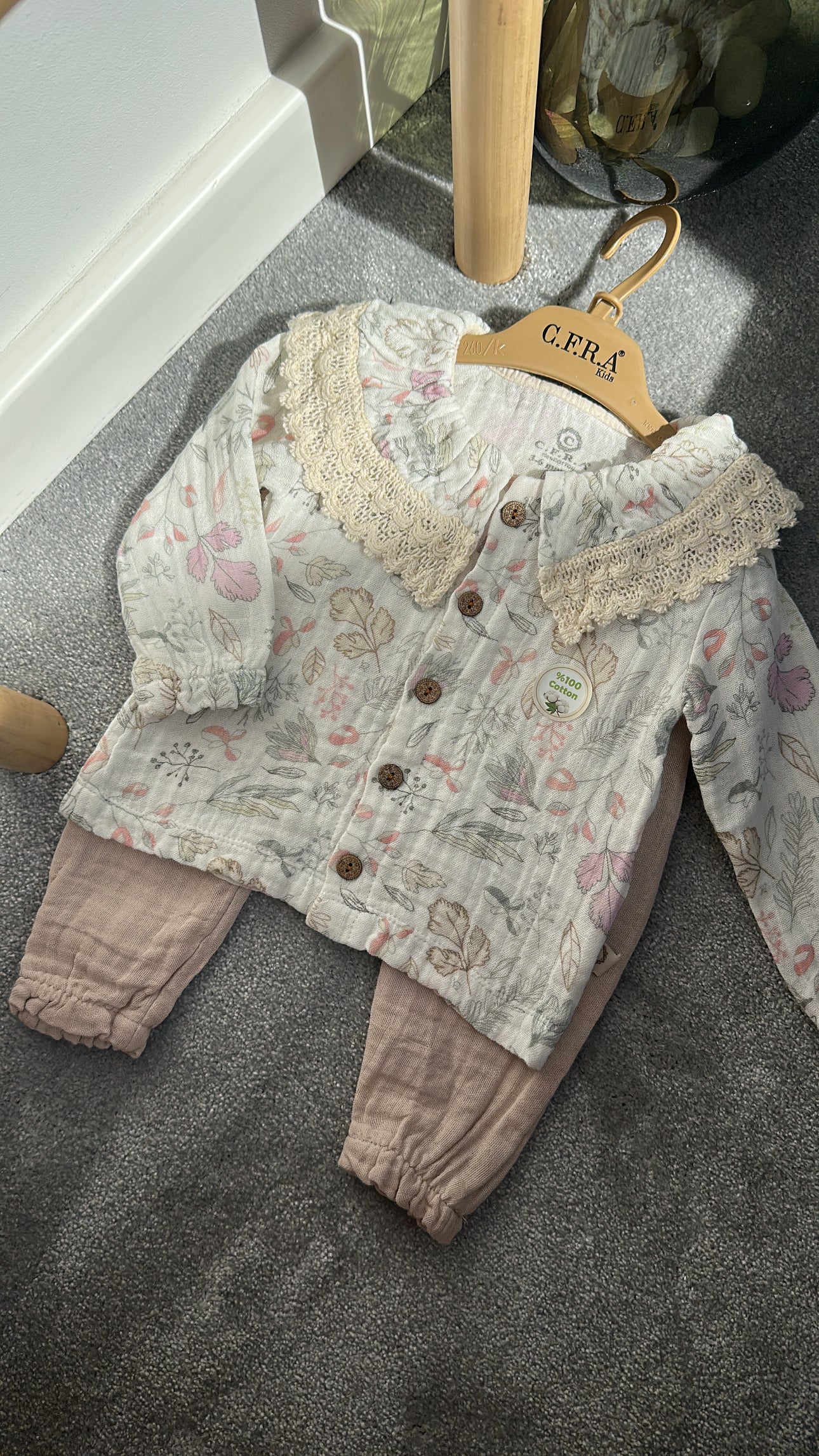 Un set adorabil, confecționat din bumbac moale și prietenos cu pielea delicată a celor mici. Bluza cu guler rotunjit și broderie florală fină aduce un plus de eleganță, iar pantalonii comozi, cu talie elastică, oferă libertate de mișcare. Ideal pentru plimbări, grădiniță sau ocazii speciale.